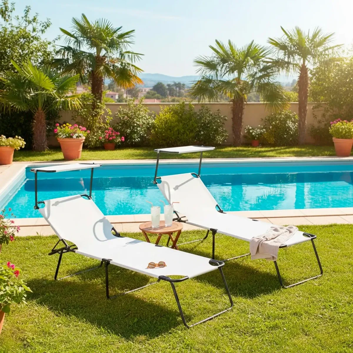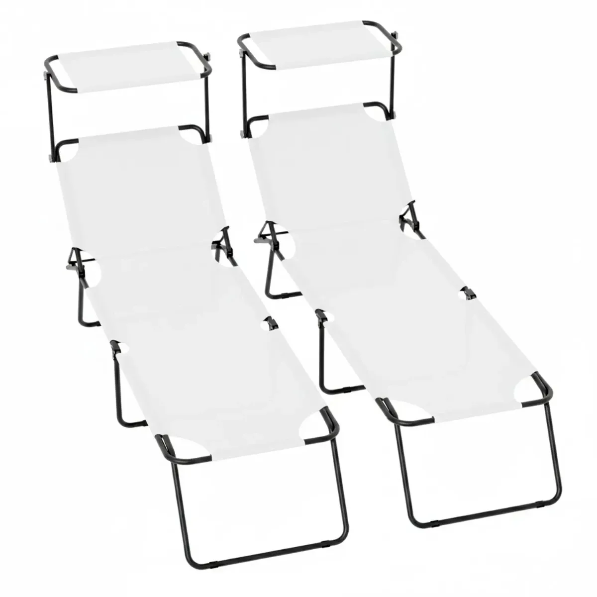 2 Lettini Pieghevoli con Tettuccio Regolabile e Schienale Reclinabile, Struttura in Metallo Nero, Sdraio Prendisole per Spiaggia, Mare, Giardino e Piscina - 187 x 53 x 24 cm