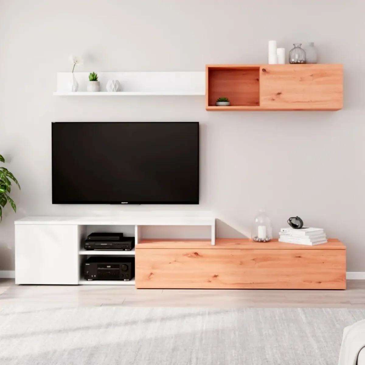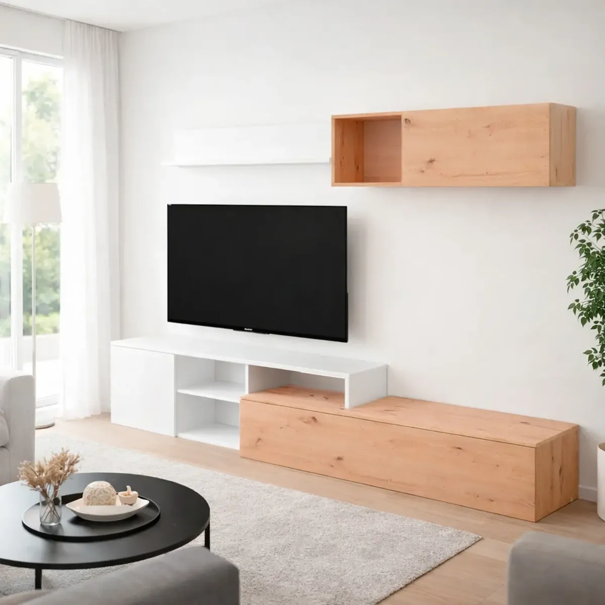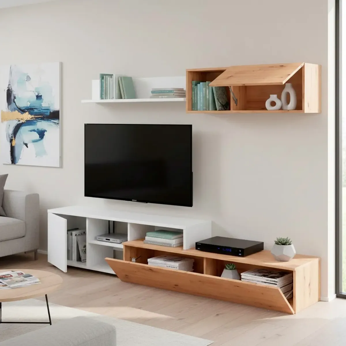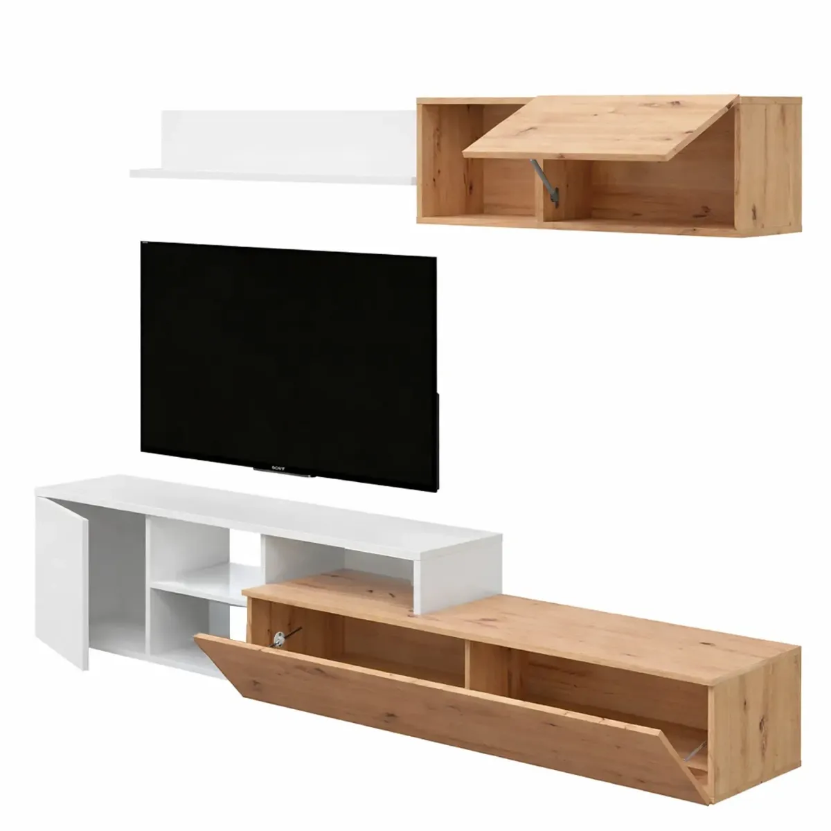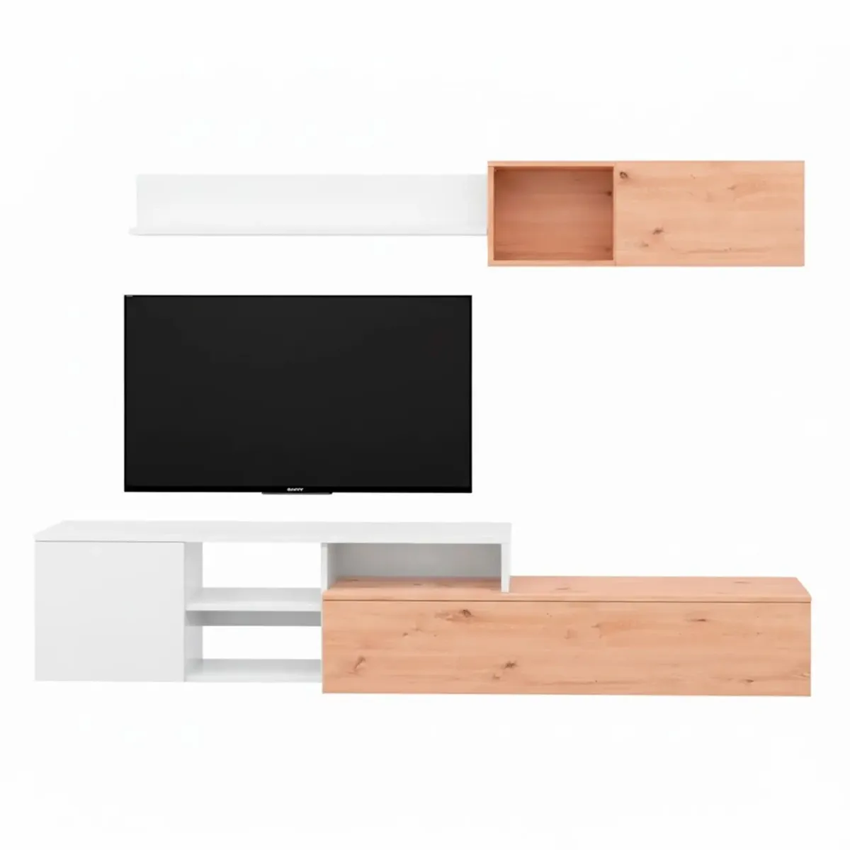 Parete Attrezzata Soggiorno Mobile TV Con Modulo Superiore E Mensola Foro Passacavi Design Moderno Per Zona Living Elegante E Funzionale 220 x 44 x 40 Cm