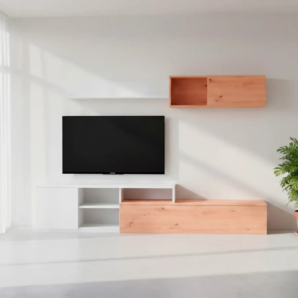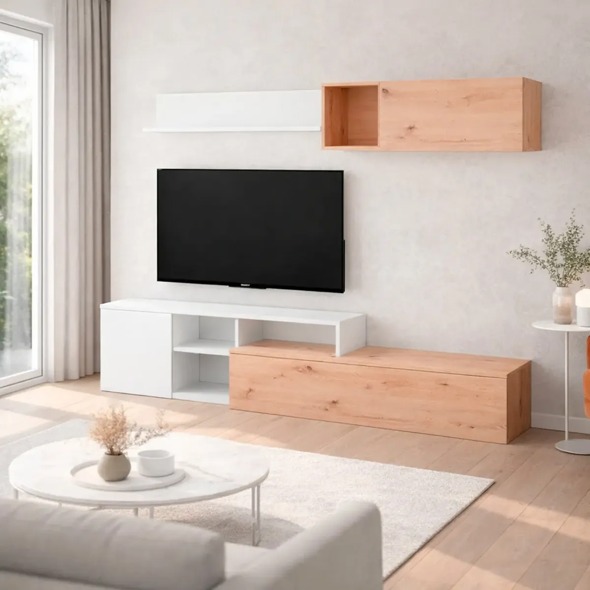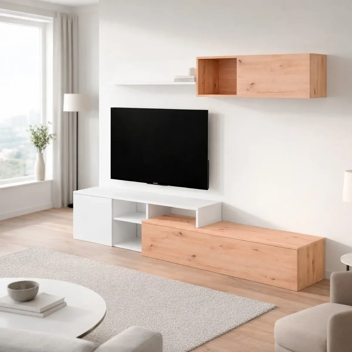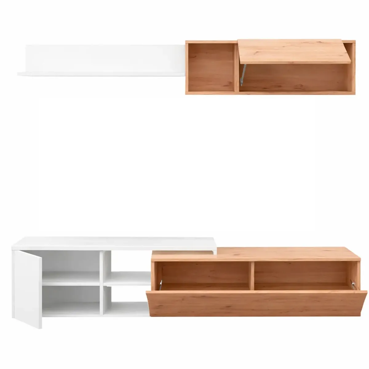 Parete Attrezzata Soggiorno Mobile TV Con Modulo Superiore E Mensola Foro Passacavi Design Moderno Per Zona Living Elegante E Funzionale 220 x 44 x 40 Cm