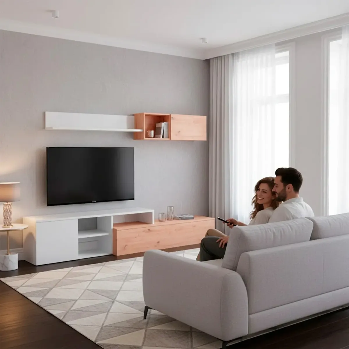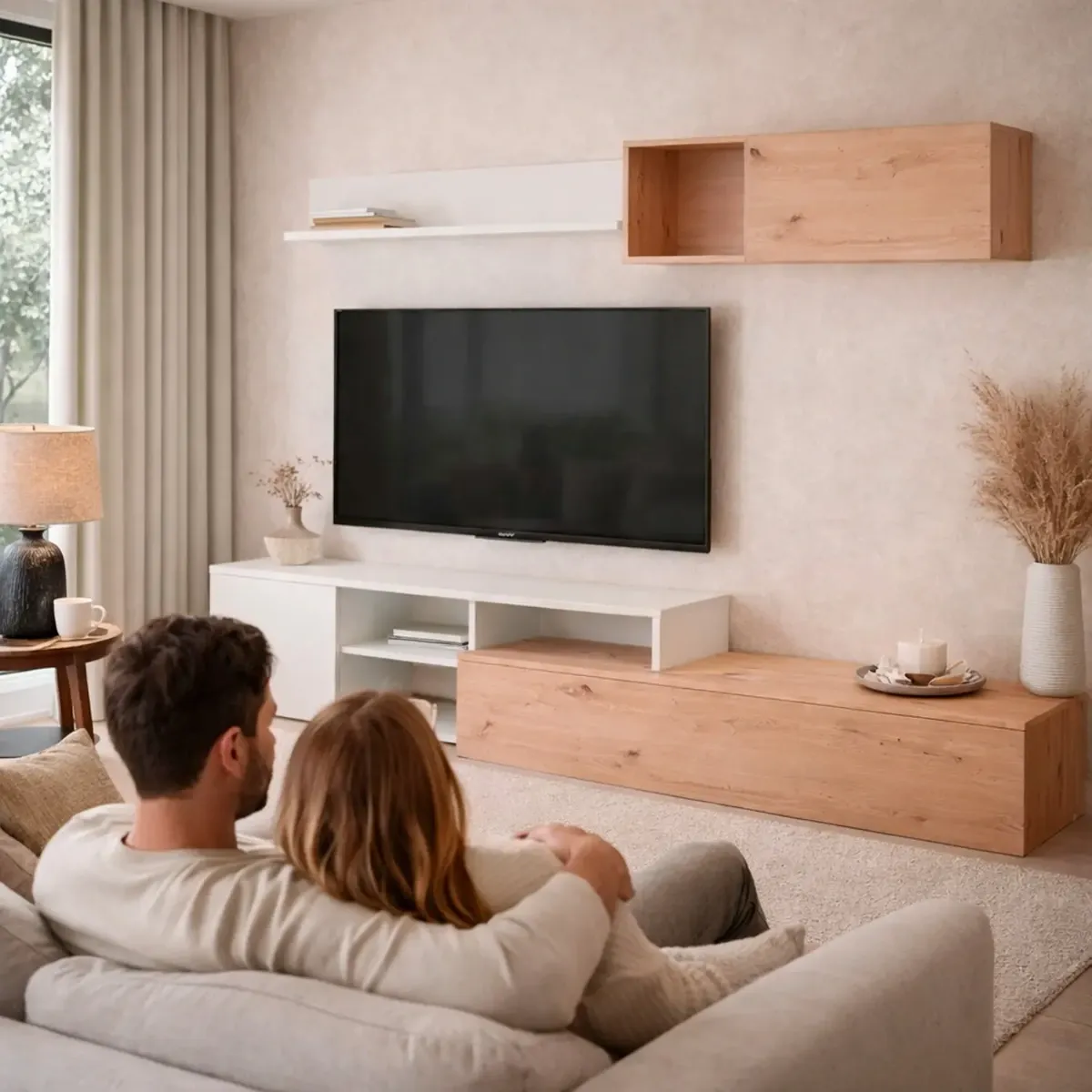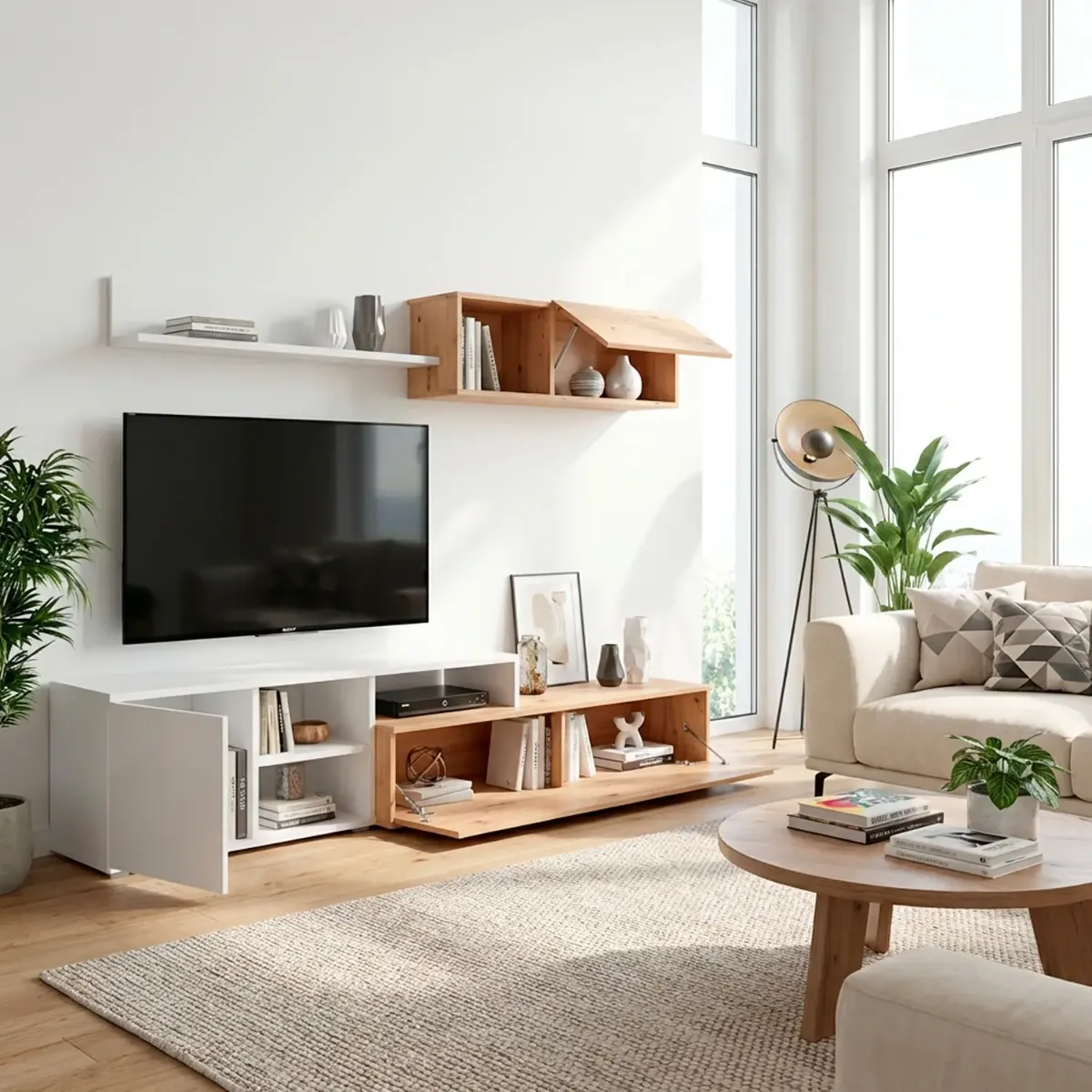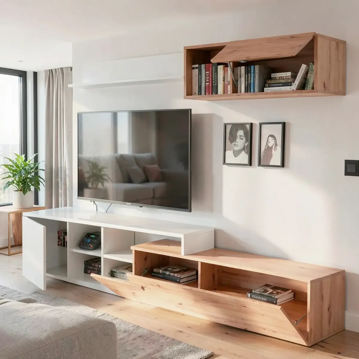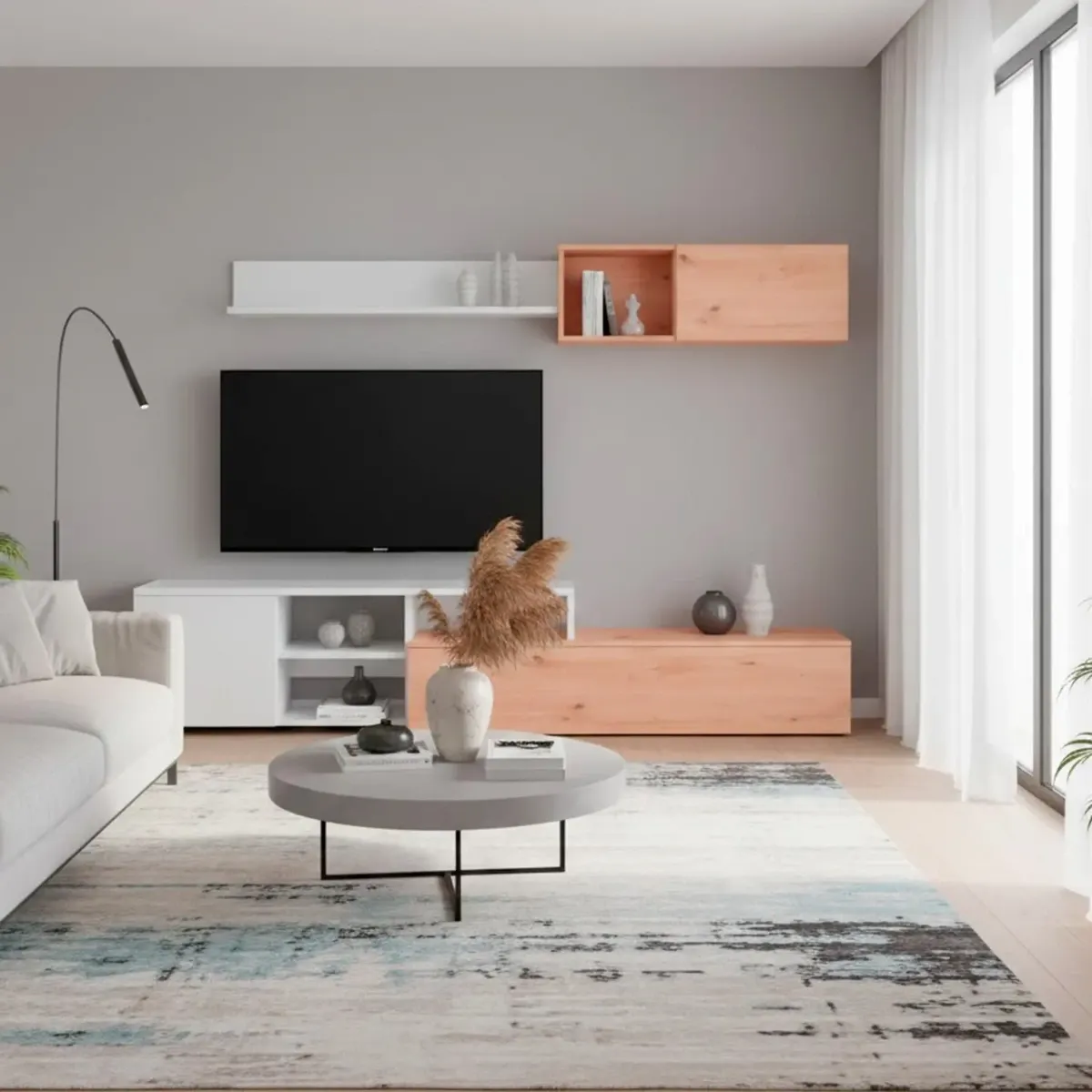 Parete Attrezzata Soggiorno Mobile TV Con Modulo Superiore E Mensola Foro Passacavi Design Moderno Per Zona Living Elegante E Funzionale 220 x 44 x 40 Cm
